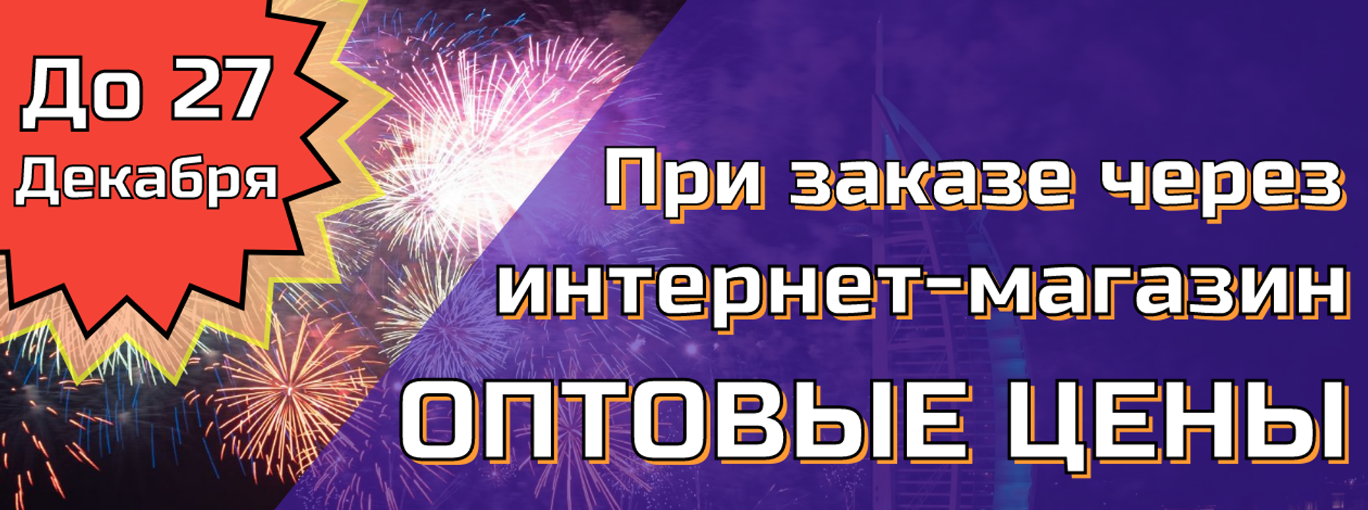 АКЦИЯ: Оптовые цены на все виды фейерверков только при заказе через интернет-магазин. Акция не распространяется на розничные магазины сети. Минимальная сумма заказа 1.000 рублей. Дата окончания акции 27 декабря 2023 года включительно.